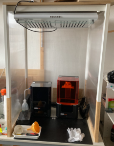 Poste de travail comprenant l’imprimante résine ultrarapide Prusa SL1S, la machine de séchage/durcissement/mise en température de la résine CW1. La technologie d’impression par stéréolitographie permet de réaliser de petits objets avec un degré de précision très élevé comparé à la FDM. Les résines photosensibles sont des substances à manier avec prudence en raison de leur dangerosité pour la santé et l’environnement en cas d’utilisation incorrecte.