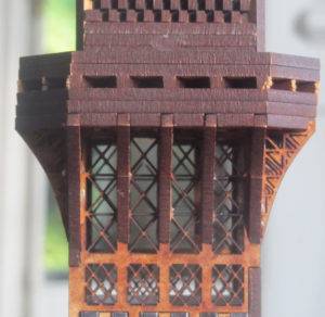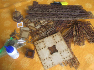 De retour en Suisse, petite visite sur thingiverse, avec les enfants, pour récupérer le modèle (réalisé par un Australien, et disponible sous licence Creative Commons). Passage dans un magasin pour me procurer du MDF 3mm, puis direction le FabLab Chène 20. Le dessin original a été fait pour une découpeuse de 90×60 cm. Celle du FabLab fait 60×60, mais grâce à l’aide de Richard, le problème est vite résolu et le dessin adapté. Et pendant que la machine fait son travail, je discute avec les autres membres présents de mon projet, de leurs projets, on s’échange impressions, trucs et astuces, et surtout on partage des connaissances. C’est ainsi que je découvre plein d’informations non seulement sur le fonctionnement de la machine, mais aussi sur la technique de construction de la tour « originale », ainsi que sur le contexte historique. Et, une fois de plus, la magie du FabLab opère : pendant que les projets se matérialisent, la connaissance circule, des personnes avec des compétences, des sensibilités et des vécus différents interagissent et coopèrent.